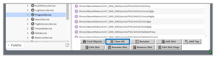 9. On the ProgramServices/BatchEditor screen, click the [Clear All] button to remove the currently filtered objects. This prevents mistakenly applying new configurations to any previously configured objects.